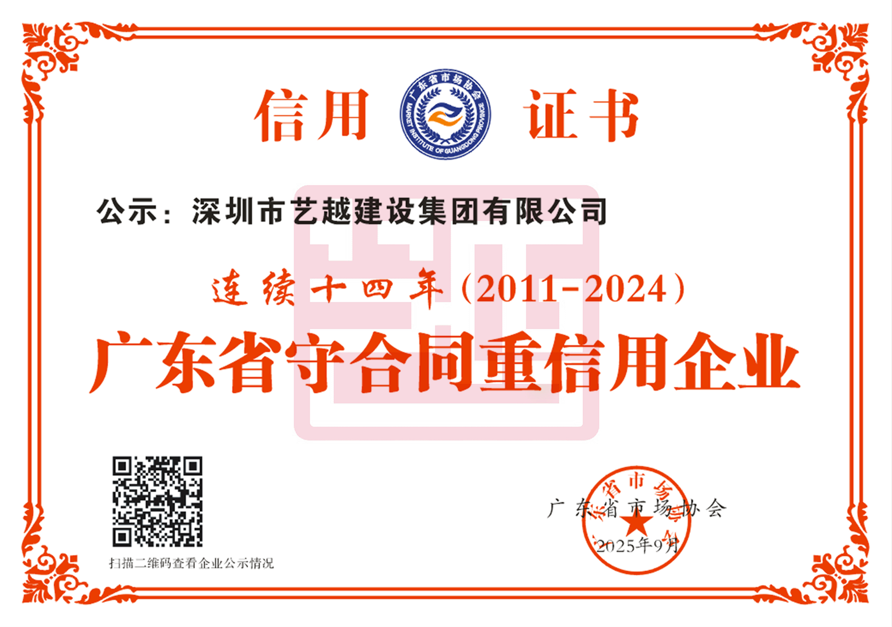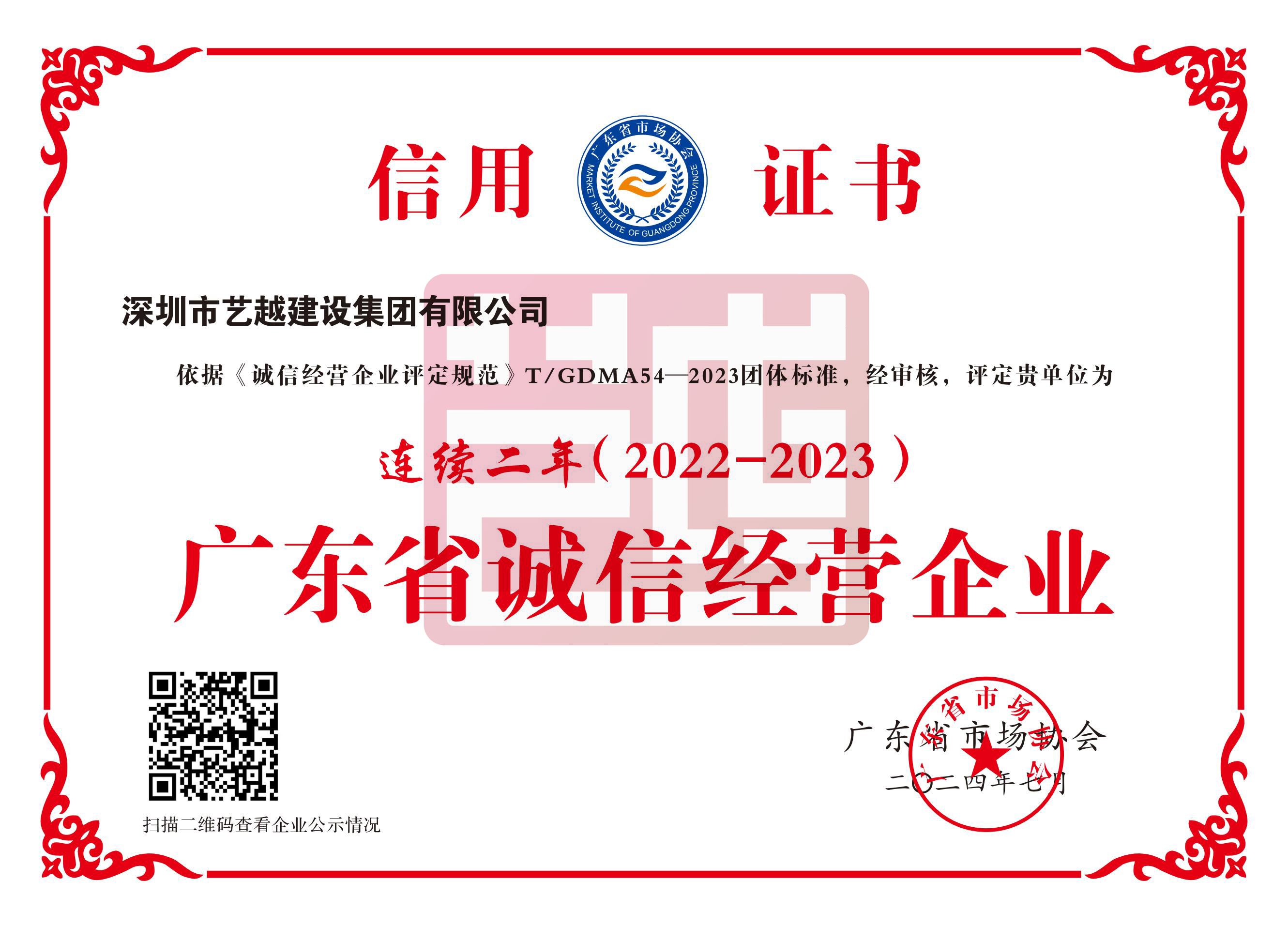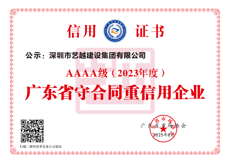 深圳市藝越建設集團有限公司,成立于2010年10月22日,注冊資金為6180萬元,是一家是集建筑、室內外裝飾設計與施工、智能化、市政于一體的綜合性、專業(yè)化的集團公司。具有建筑裝修裝飾工程專業(yè)承包壹級、建筑幕墻工程專業(yè)承包壹級、建筑機電安裝工程專業(yè)承包壹級、消防設施工程專業(yè)承包壹級、鋼結構工程專業(yè)承包壹級、中國展協(xié)展覽工程企業(yè)壹級、中國展協(xié)展覽陳列工程設計與施工壹級、潔凈工程資質壹級、防水防腐保溫工程專業(yè)承包壹級、特種工程(結構補強)不分等級、建筑裝飾工程設計專項甲級、建筑幕墻工程設計專項甲級、輕型鋼結構工程設計專項乙級、消防設施工程設計專項乙級、建筑工程施工總承包貳級、市政公用工程施工總承包貳級、電子與智能化工程專業(yè)承包貳級、城市及道路照明工程專業(yè)承包貳級、環(huán)保工程專業(yè)承包貳級、施工勞務不分等級、承裝(修、試)電力設施許可證五級、醫(yī)療器械經營許可資質貳、叁類、安全技術防范系統(tǒng)設計施工維修資格。質量管理體系(GB/T19001-2016 / ISO9001:2015)標準認證、職業(yè)健康安全管理體系(GB/T28001-2011)標準認證,環(huán)境管理體系(GB/T24001-2016/ISO14001:2015)標準認證。中國建筑裝飾協(xié)會常務理事單位、AAA資信單位、連續(xù)十二年被評為“守合同重信用企業(yè)”。